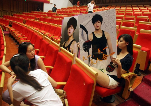 2011年8月19日,北京,李天一举行假期音乐会,几名女生在台下举着李天一的人形牌。